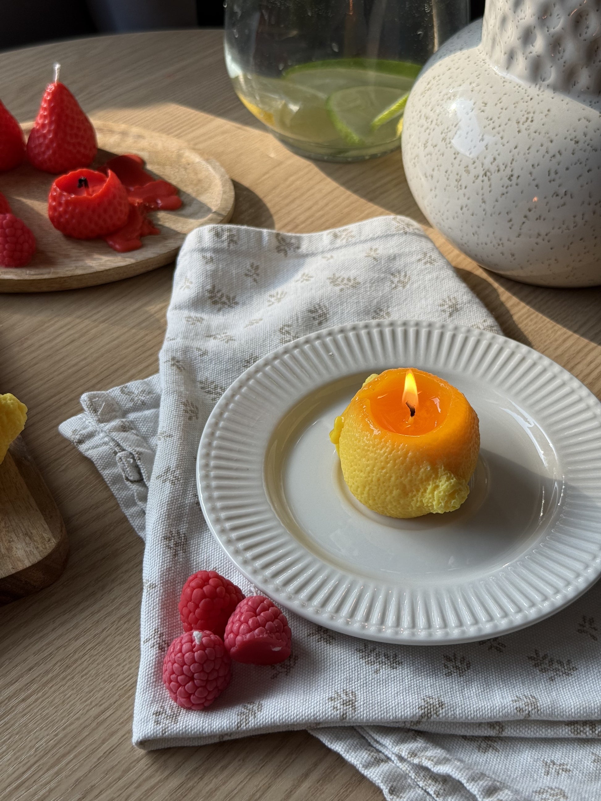 Die Früchte sind nicht beduftet und eignen sich ideal als dekoratives Element oder zum kreativen Kombinieren mit anderen Kerzen. Natürlich kannst du sie auch abbrennen – achte dabei bitte darauf, stets einen Untersetzer oder eine feuerfeste Kerzenplatte zu verwenden.